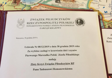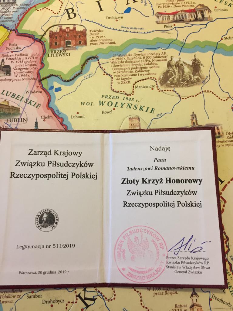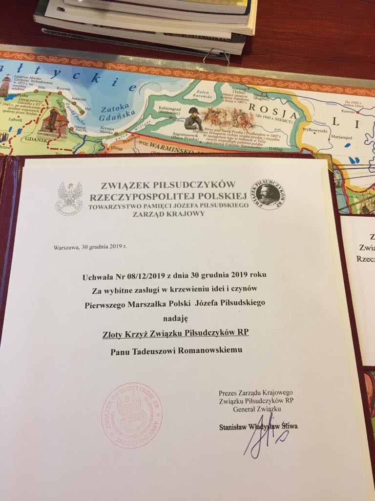 Bóg tak chciał, że w czasie spotkania w kościele w Butrymańcach prezes zarządu Krajowego Związku Piłsudczyków RP, Generał związku Stanisław Władysław Śliwa uchwałą Nr. 08/12/2019 z dnia 30 grudnia 2019 roku za wybitne zasługi w krzeiwniu idei i czynów Pierwszego Marszałka Polski Józefa Piłsudskiego nadał złoty krzyż związku Piłsudczyków RP Panu Tadeuszowi Romanowskiemu.